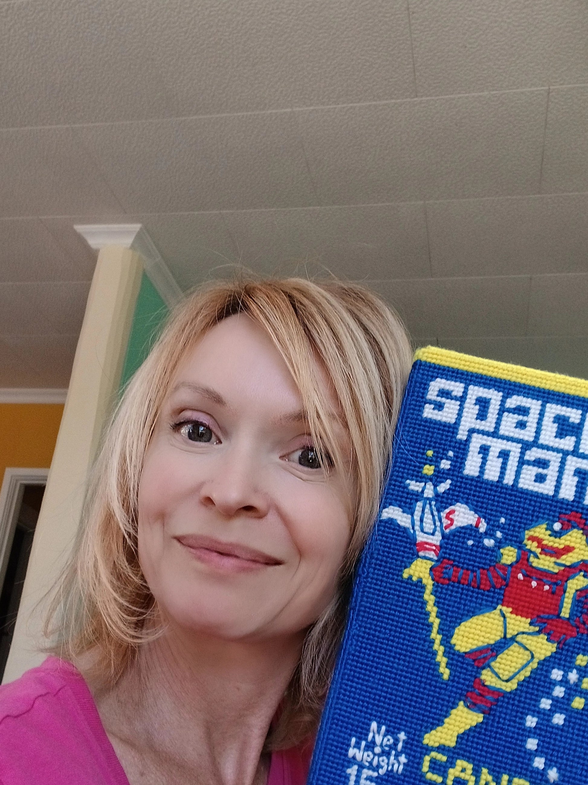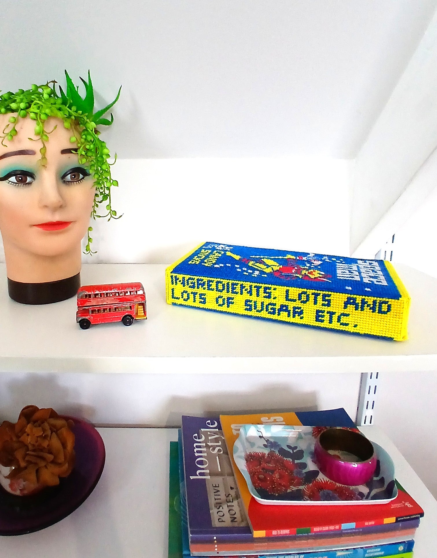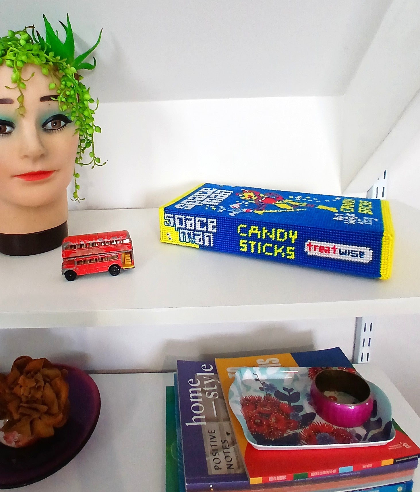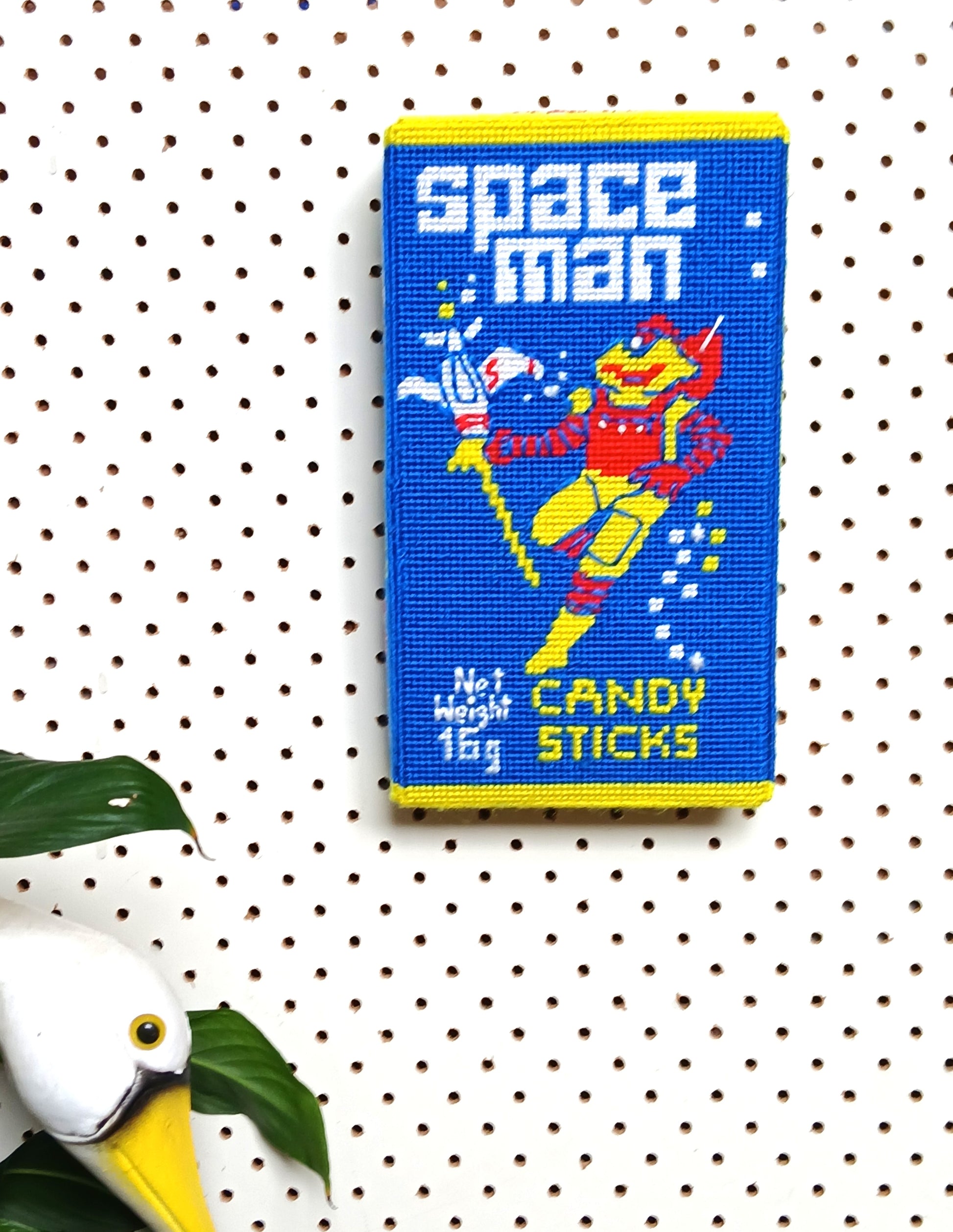 Can't stop, won't stop! Just love the Spaceman candy packet as a subject matter. Here we have a giant sized packet made with hundreds of embroidery stitches. Lovingly stitched with acrylic yarn onto a plastic canvas. You can hang it on the wall or sit it on the shelf. It measures 26cm wide x 15cm x 5mm.